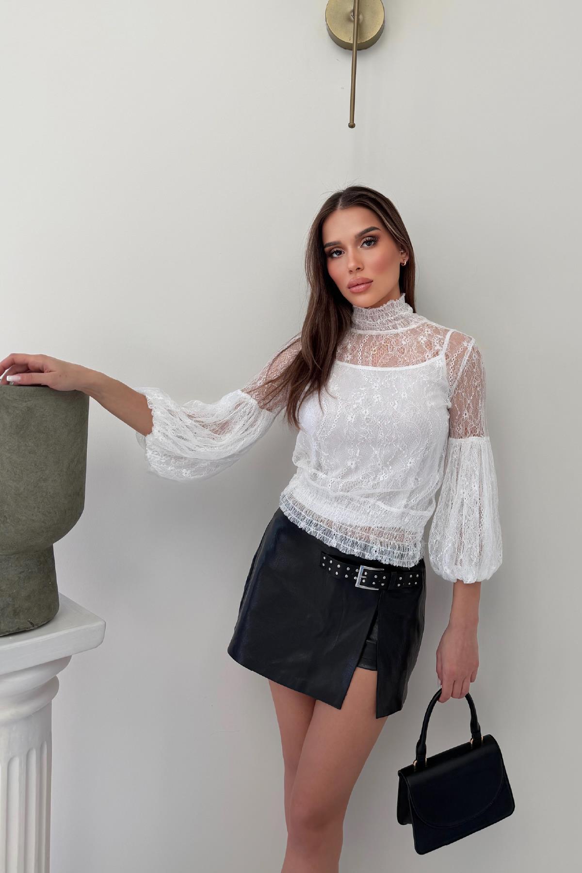 Beyaz Halter Yaka Balon Kol Detay Dantelli Bluz (RB2952)