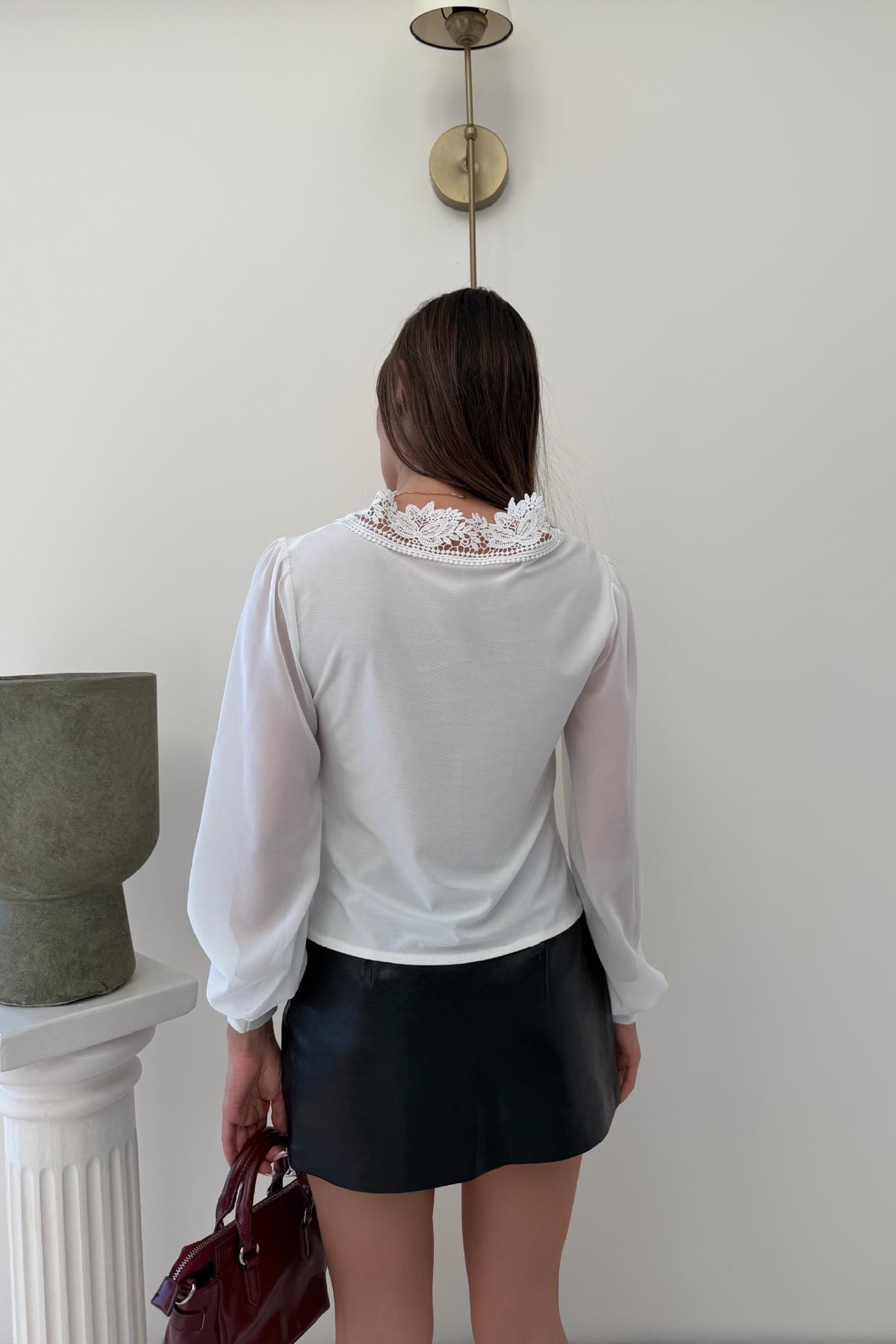 Beyaz V Yaka Dantel Detaylı Kolları Şifon Bluz (RB2948)