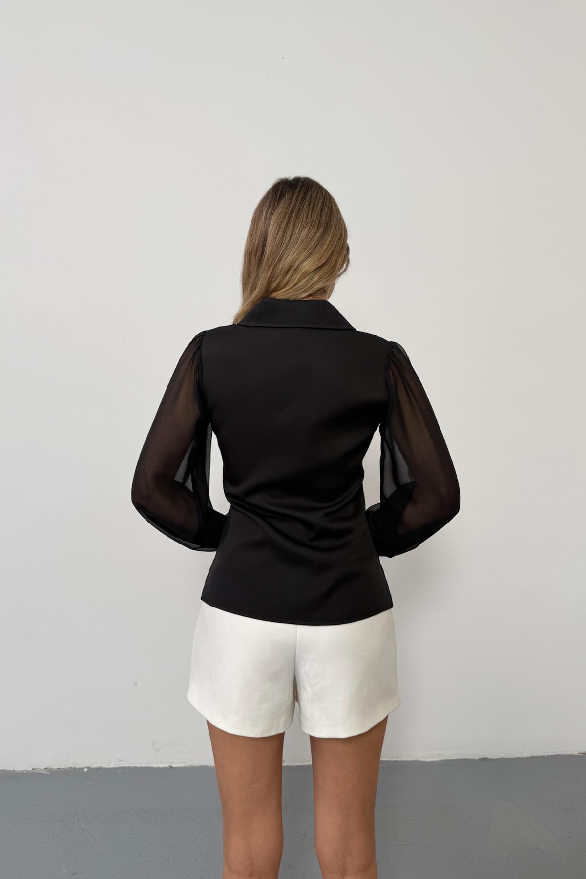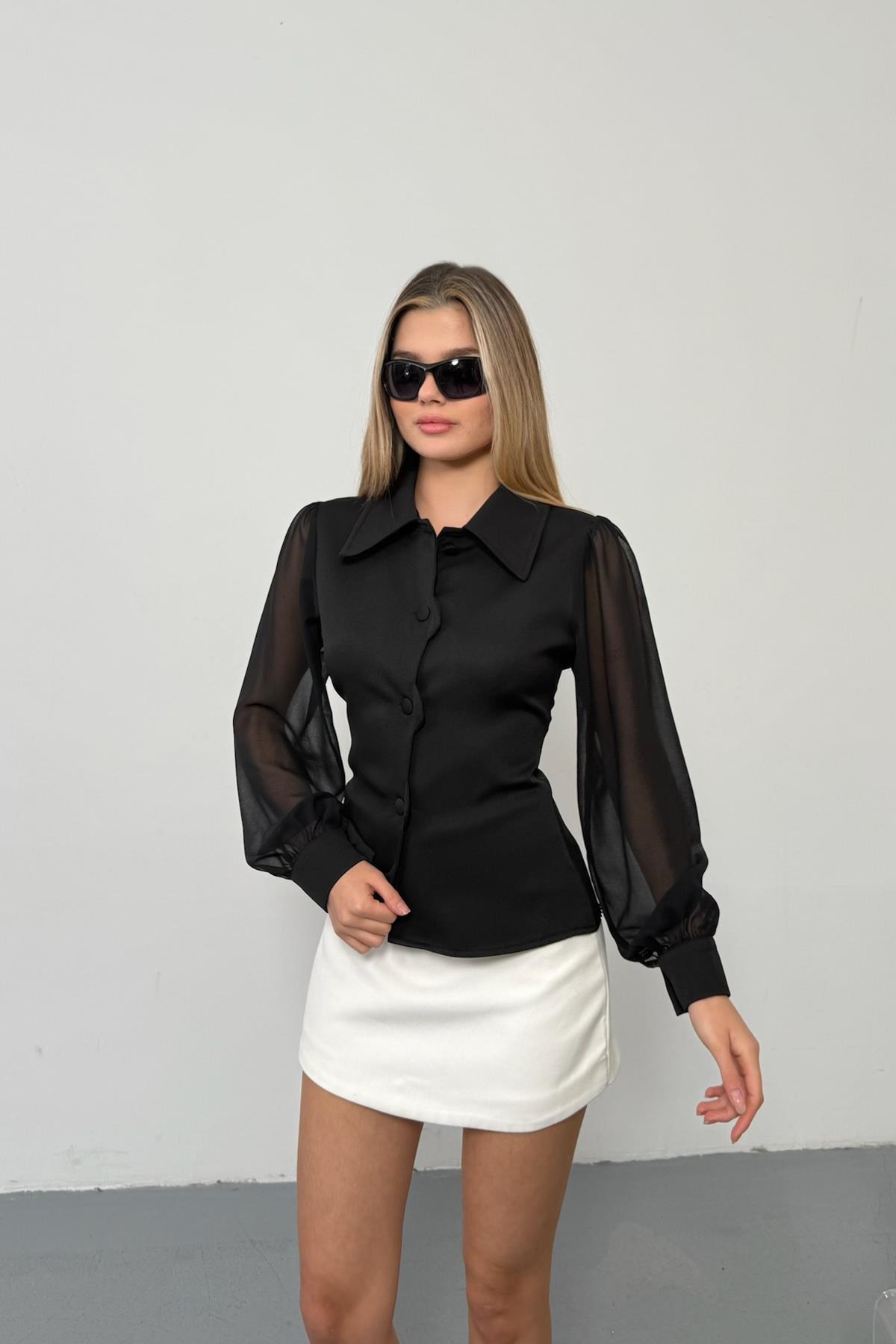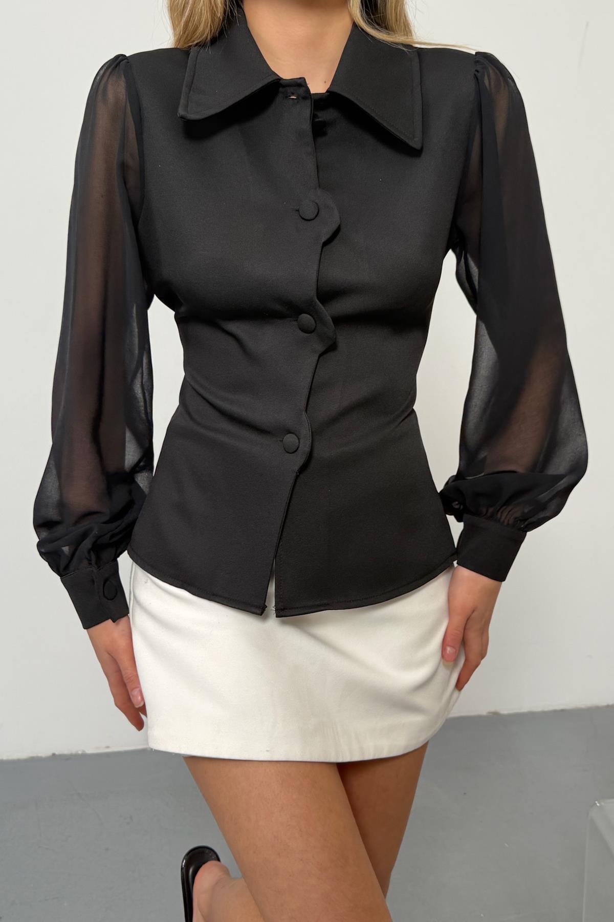 Gömlek Yaka Düğme Detaylı Kolları Şifon Bluz Siyah (RB2919)