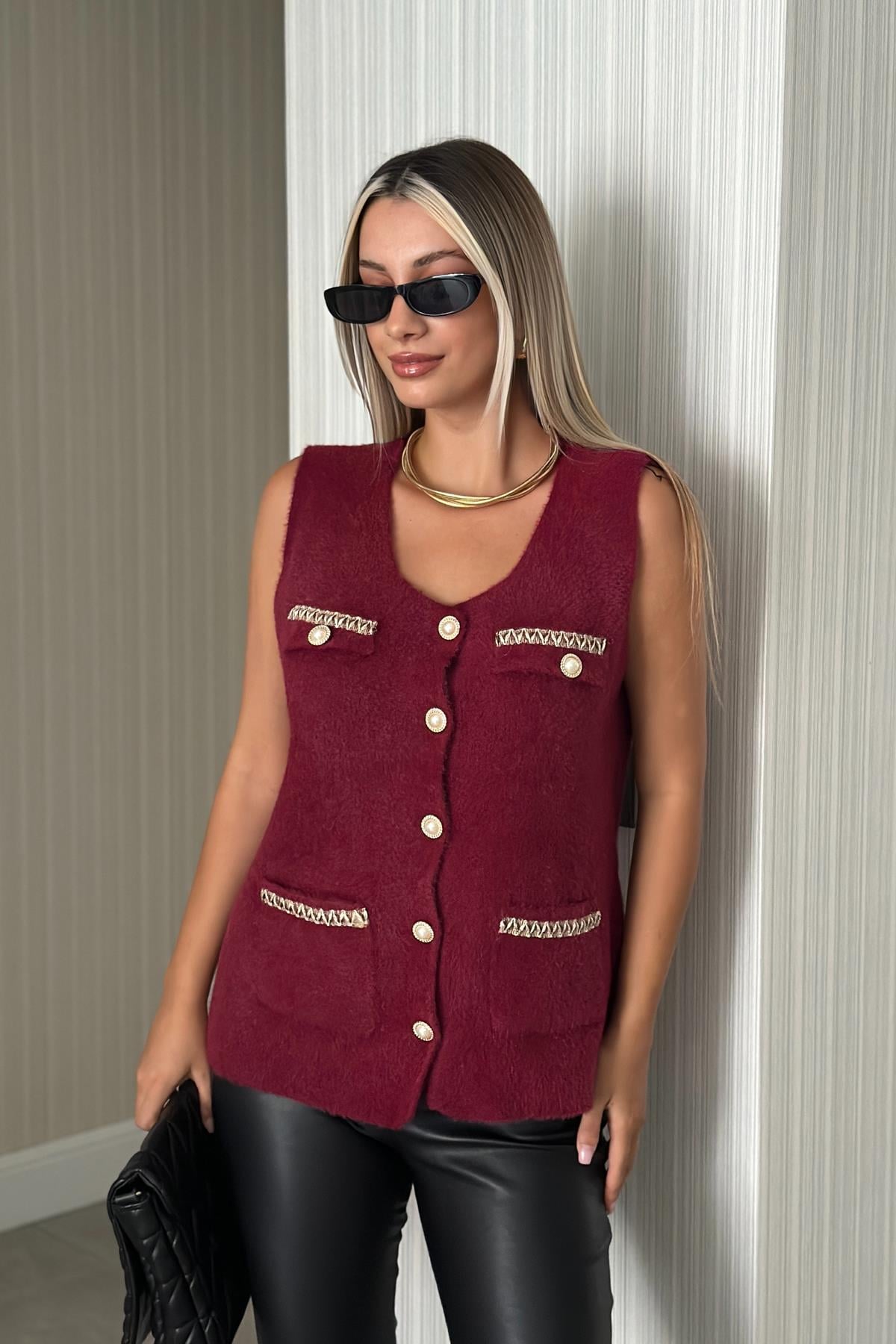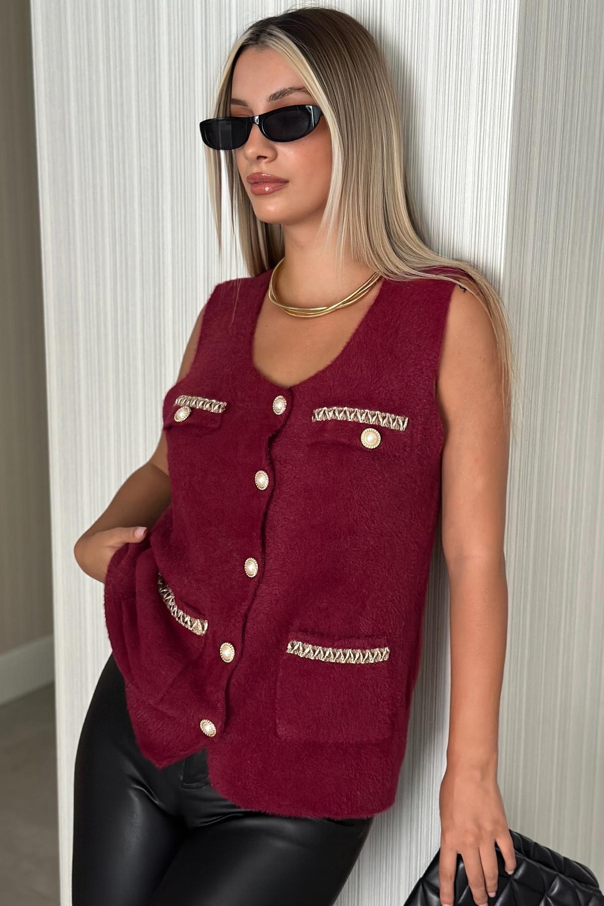 Kadın Düğme Detaylı Çift Cepli Yelek Bordo (RB0708)