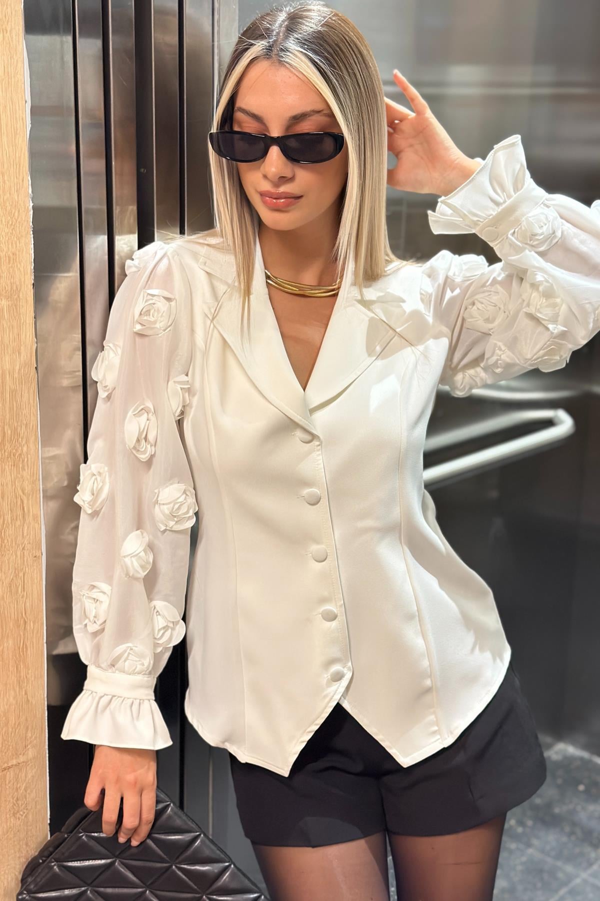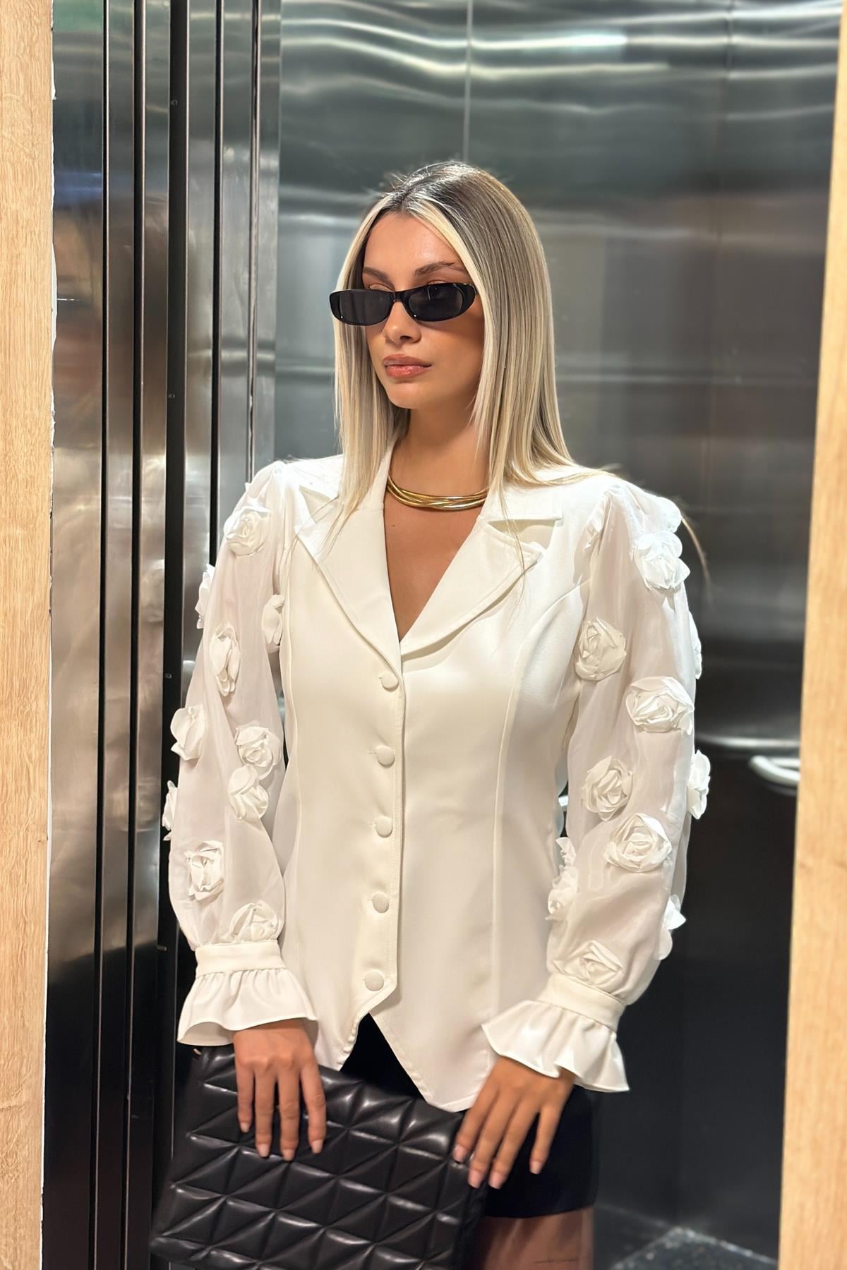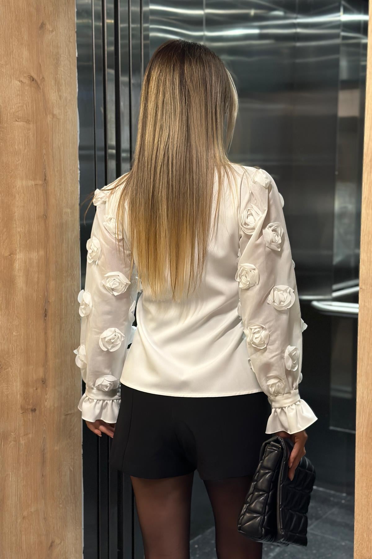 Kadın Kollari Şifon Gül Detaylı Bluz Beyaz (RB2902)