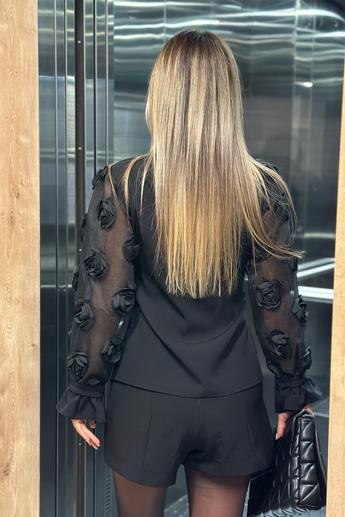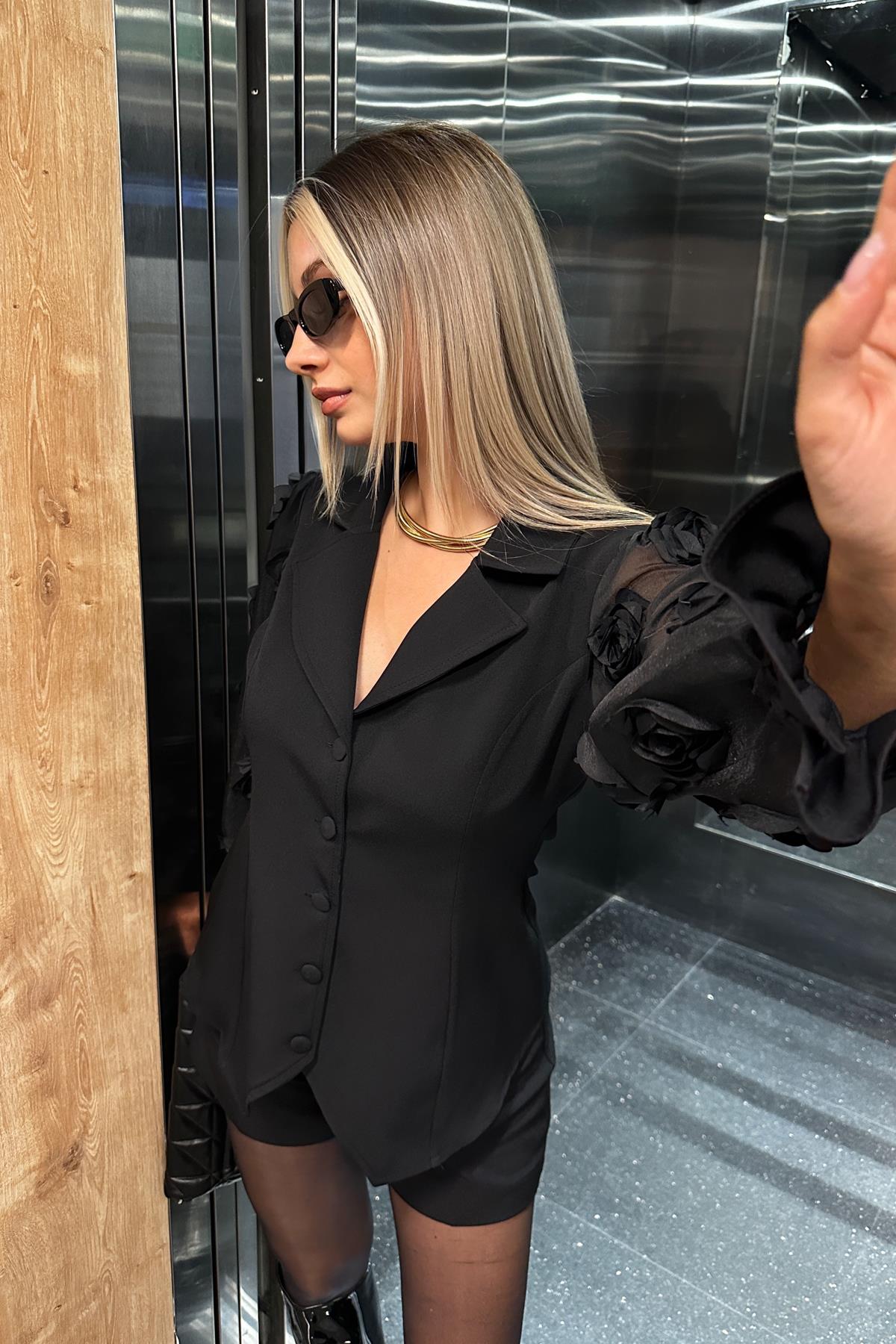 Kadın Kollari Şifon Gül Detaylı Bluz Siyah (RB2902)