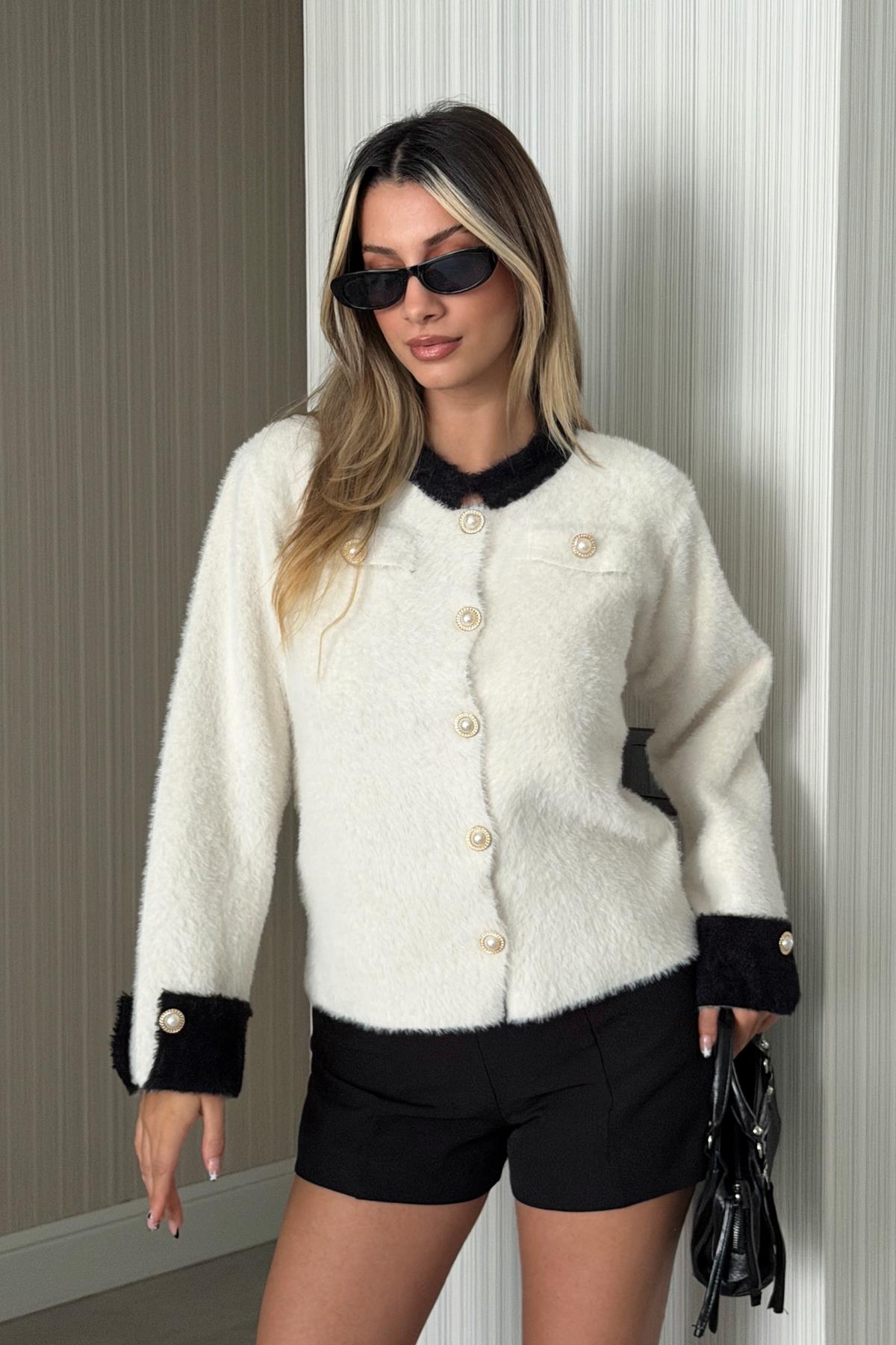 Kadın Maşet Detaylı Düğmeli Hırka Ekru (RB0713)
