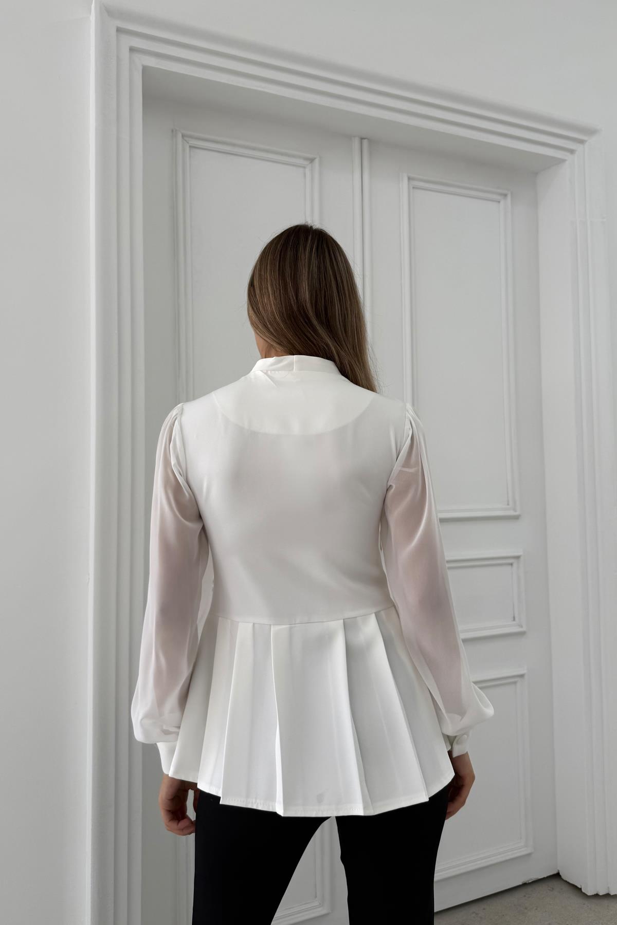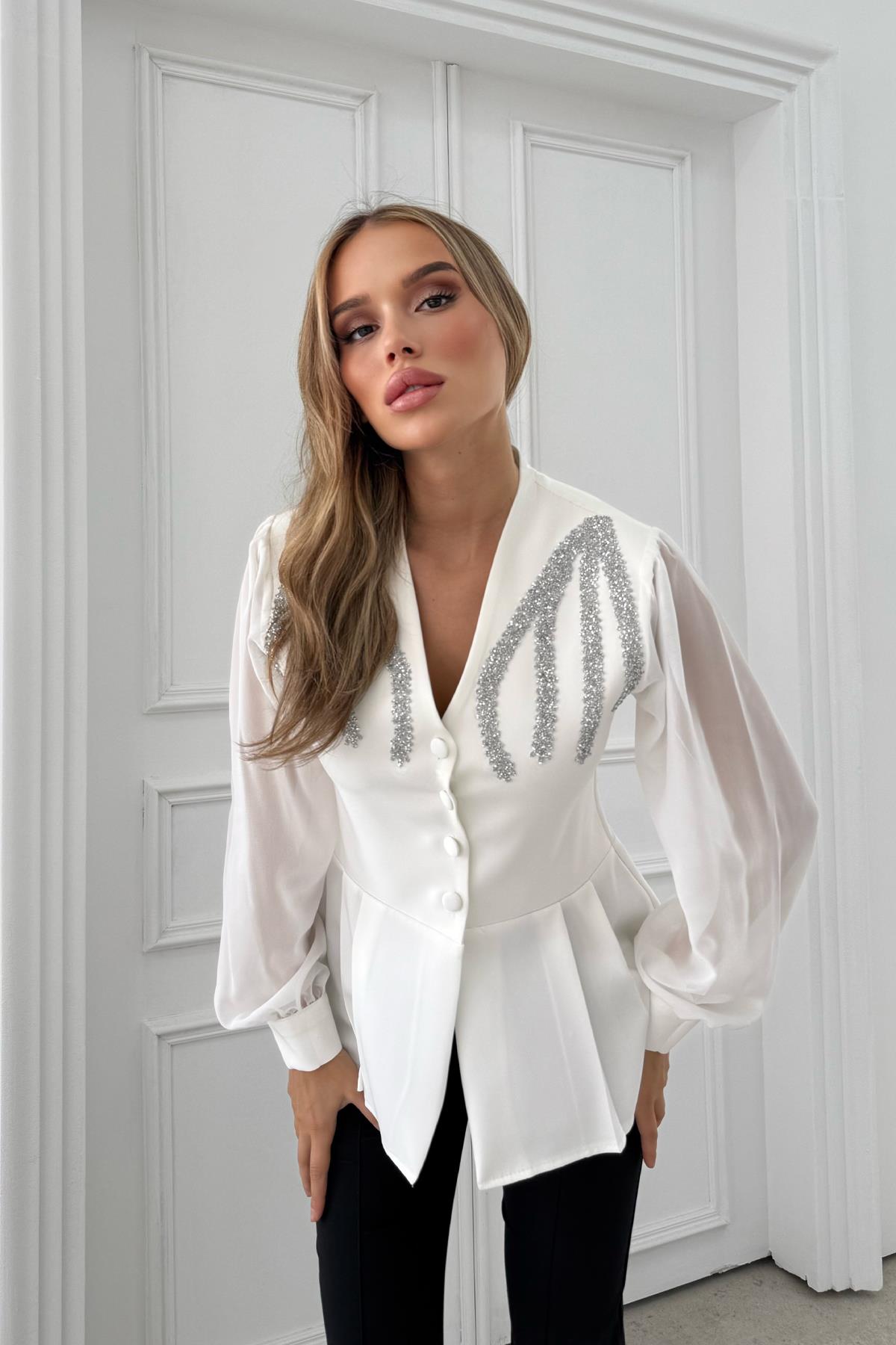 Kadın Omzu Taş İşleme Detaylı Kolları Şifon Bluz Beyaz (RB2891)