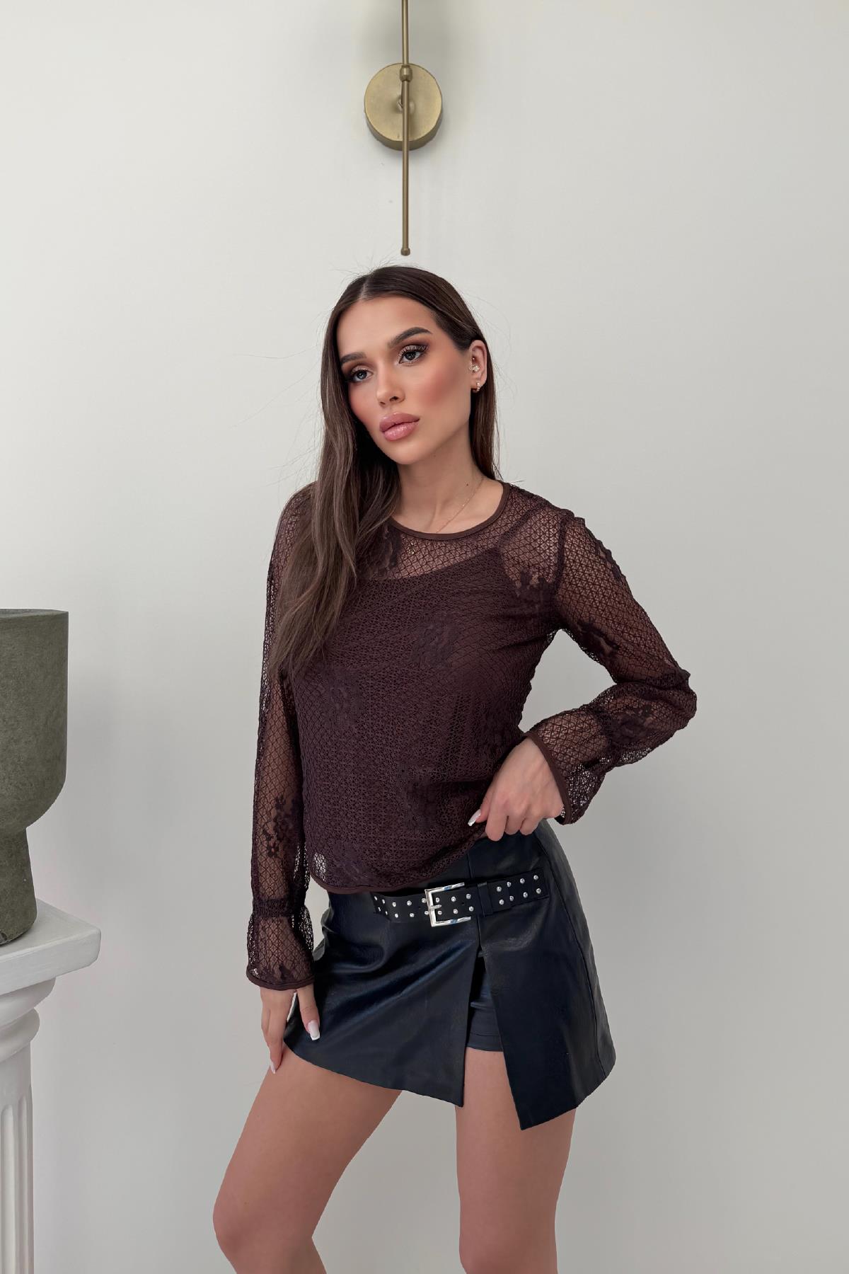 Kahverengi Bisiklet Yaka Çiçek Desen Astar Detaylı Dantelli Bluz (RB2950)
