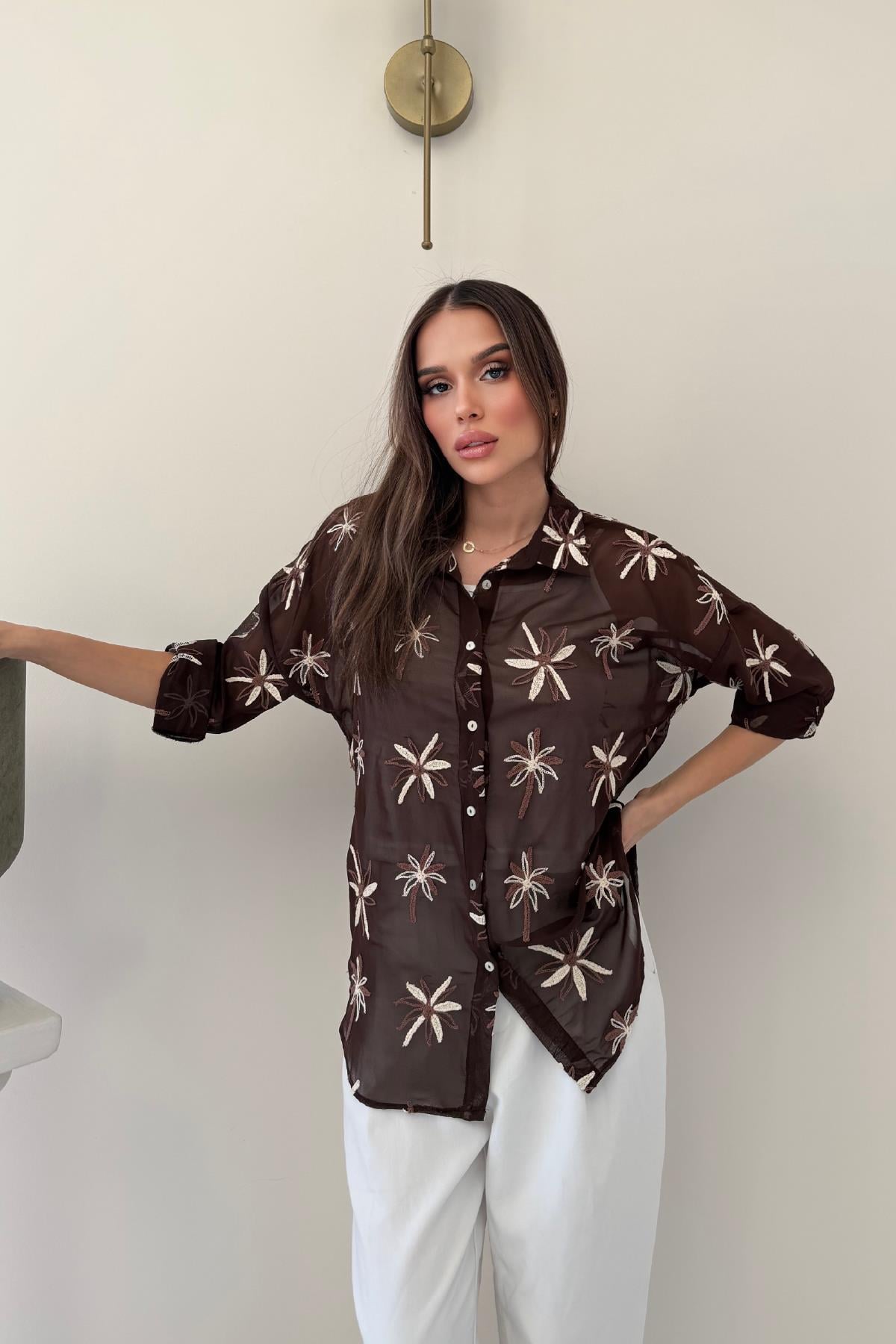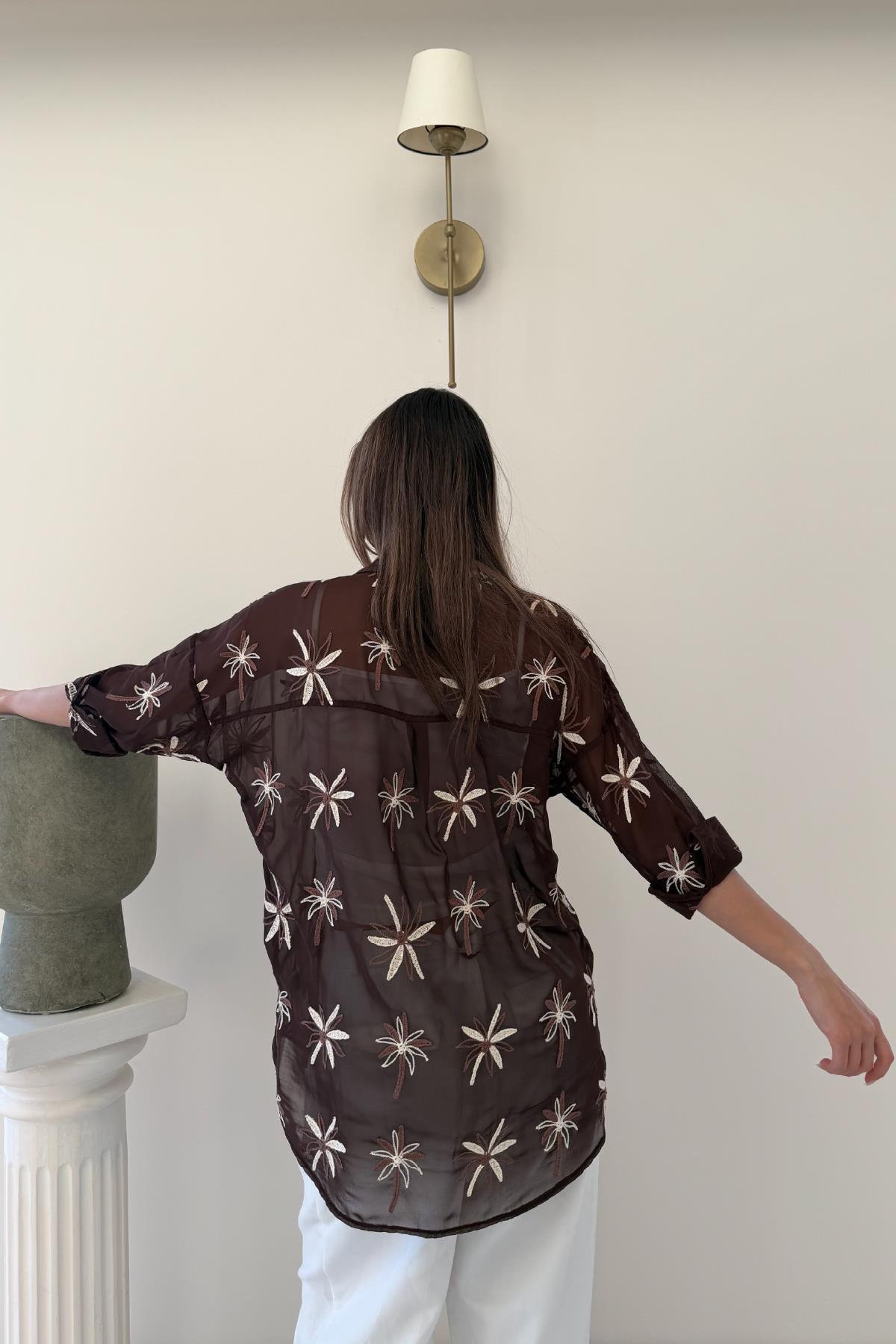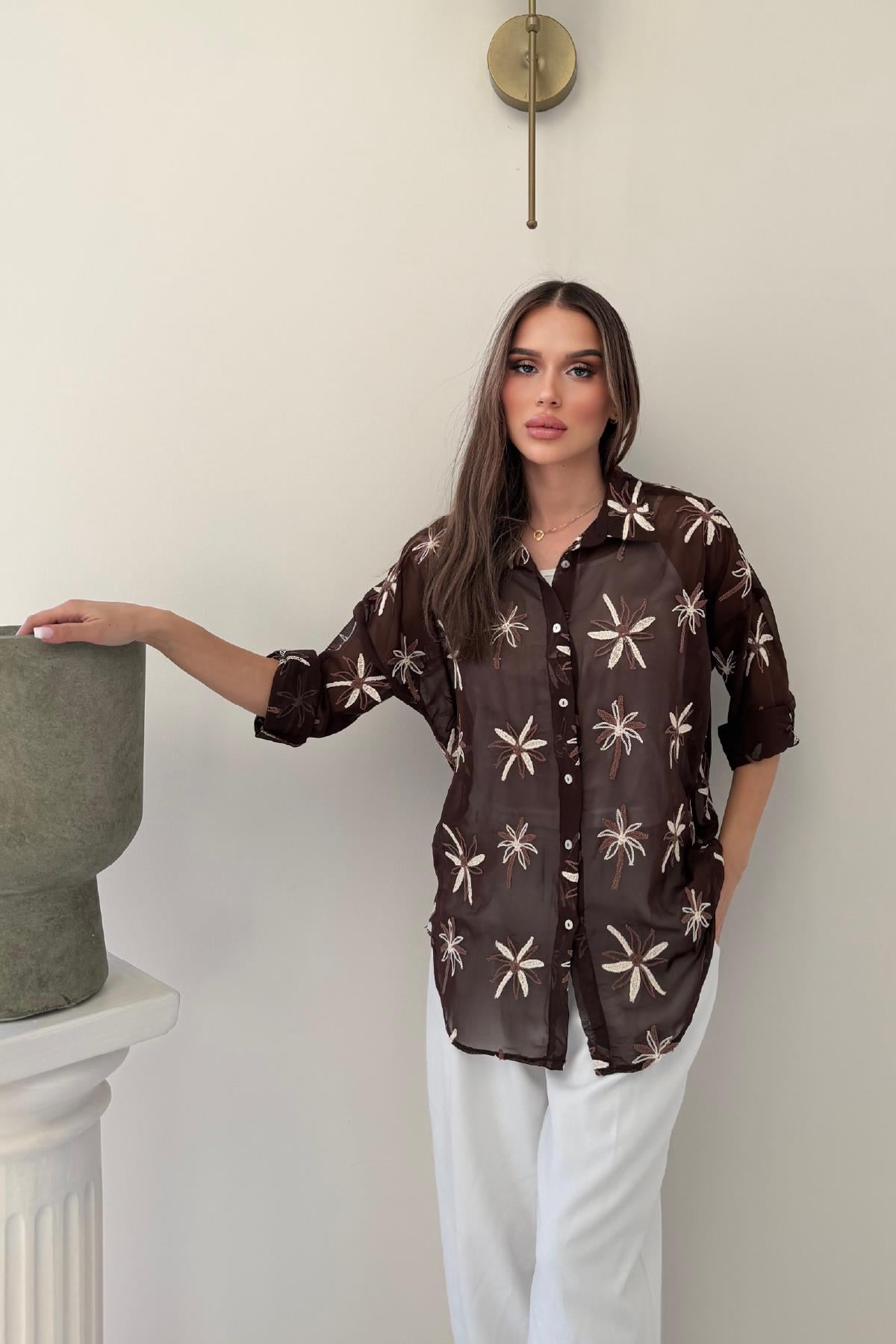 Kahverengi Çiçek İşlemeli Şifon Gömlek (RB2934)