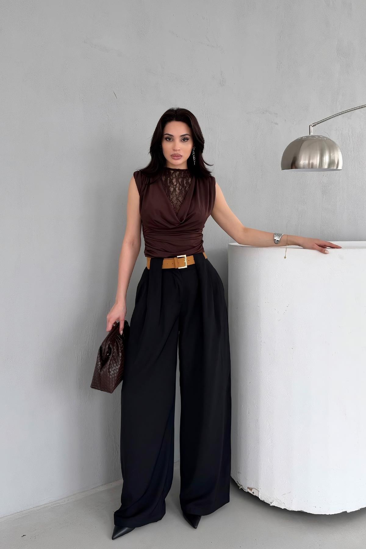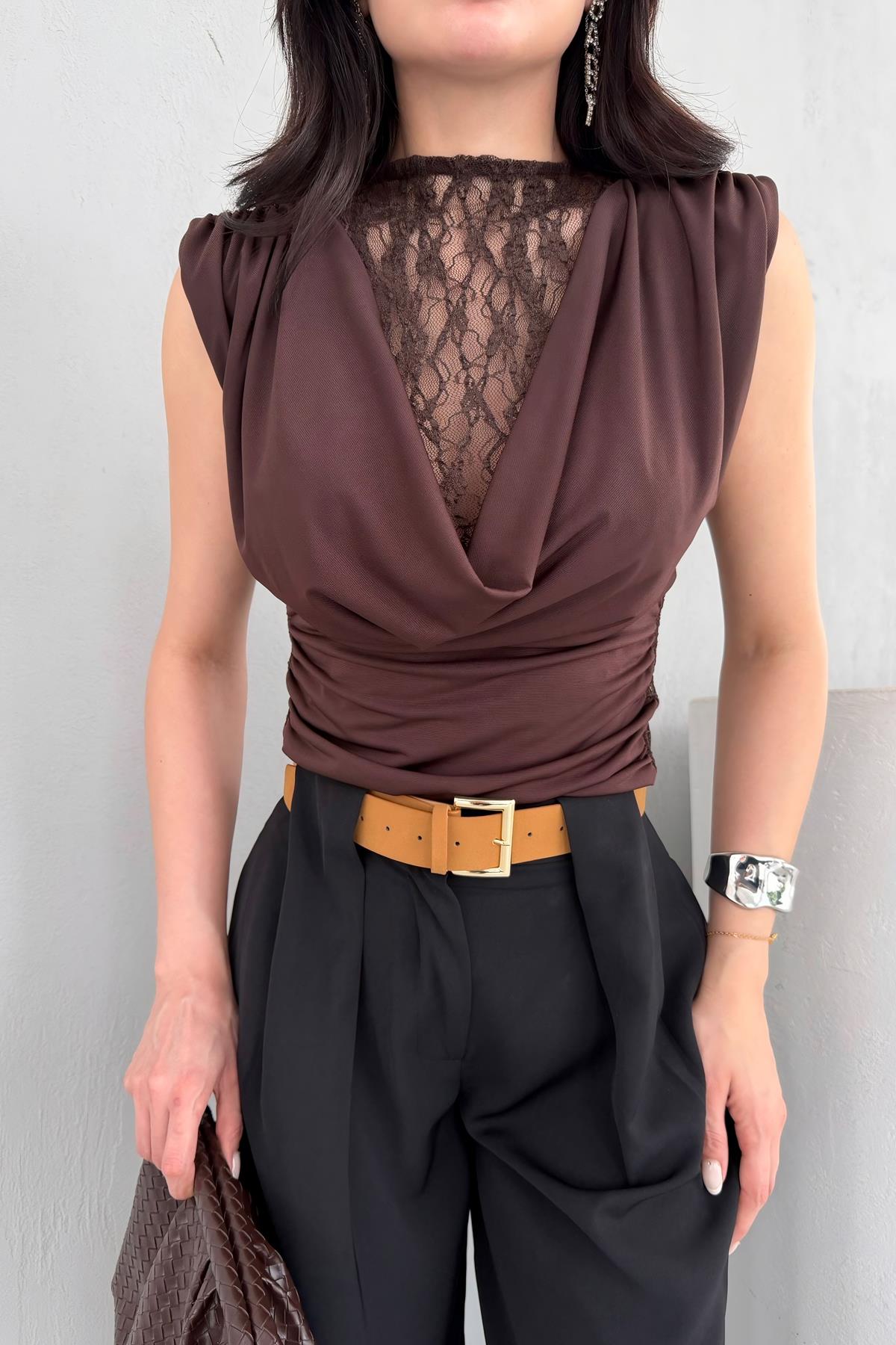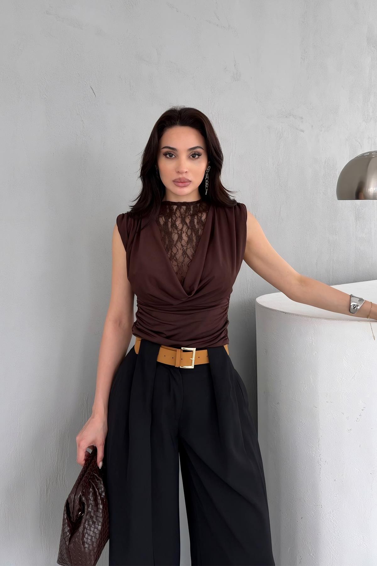 Kahverengi Dantel Detay Degaje Yaka Sıfır Kol Bluz (RB7225)