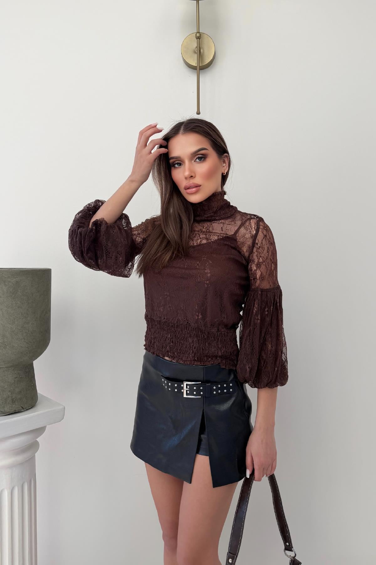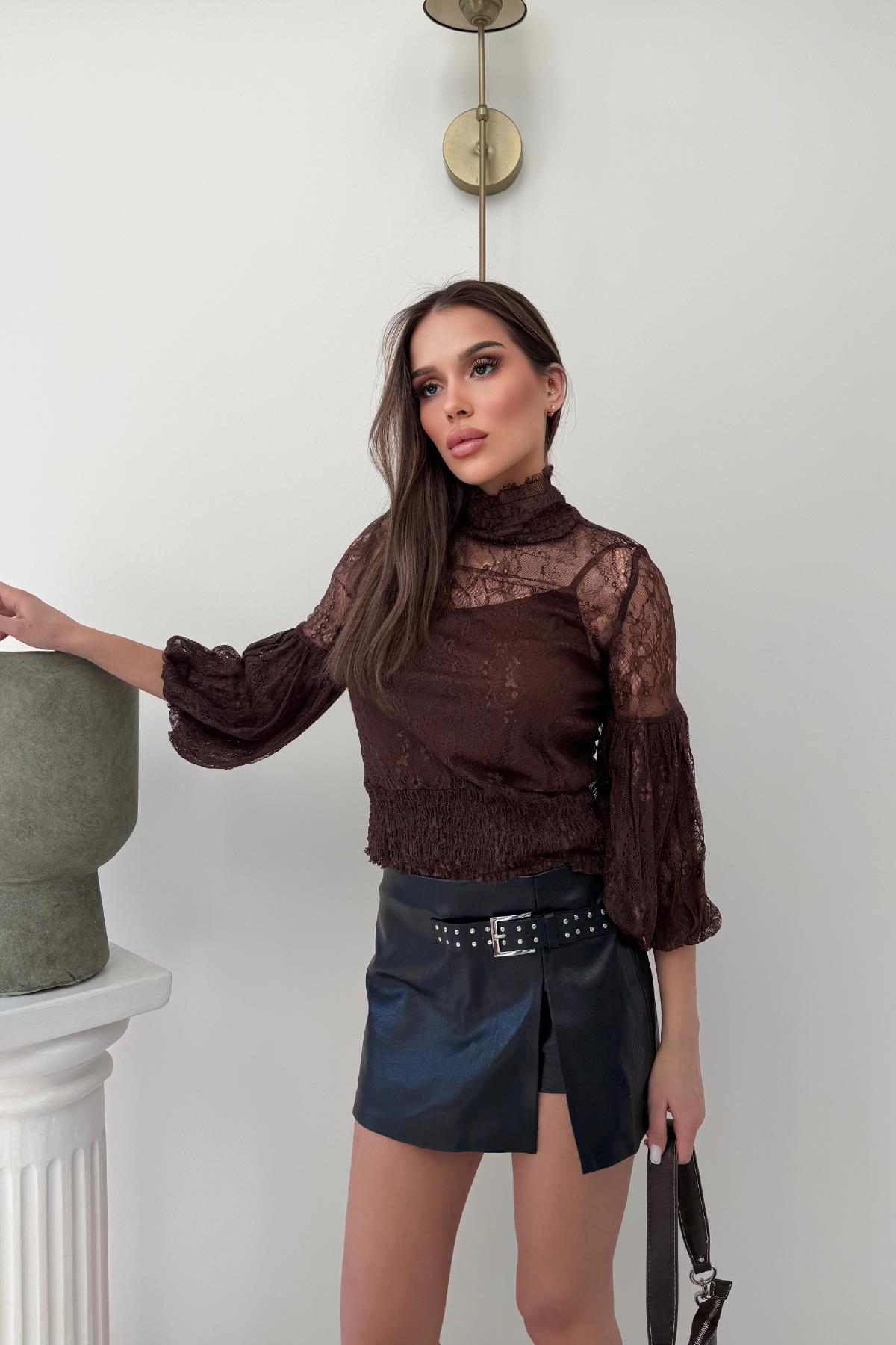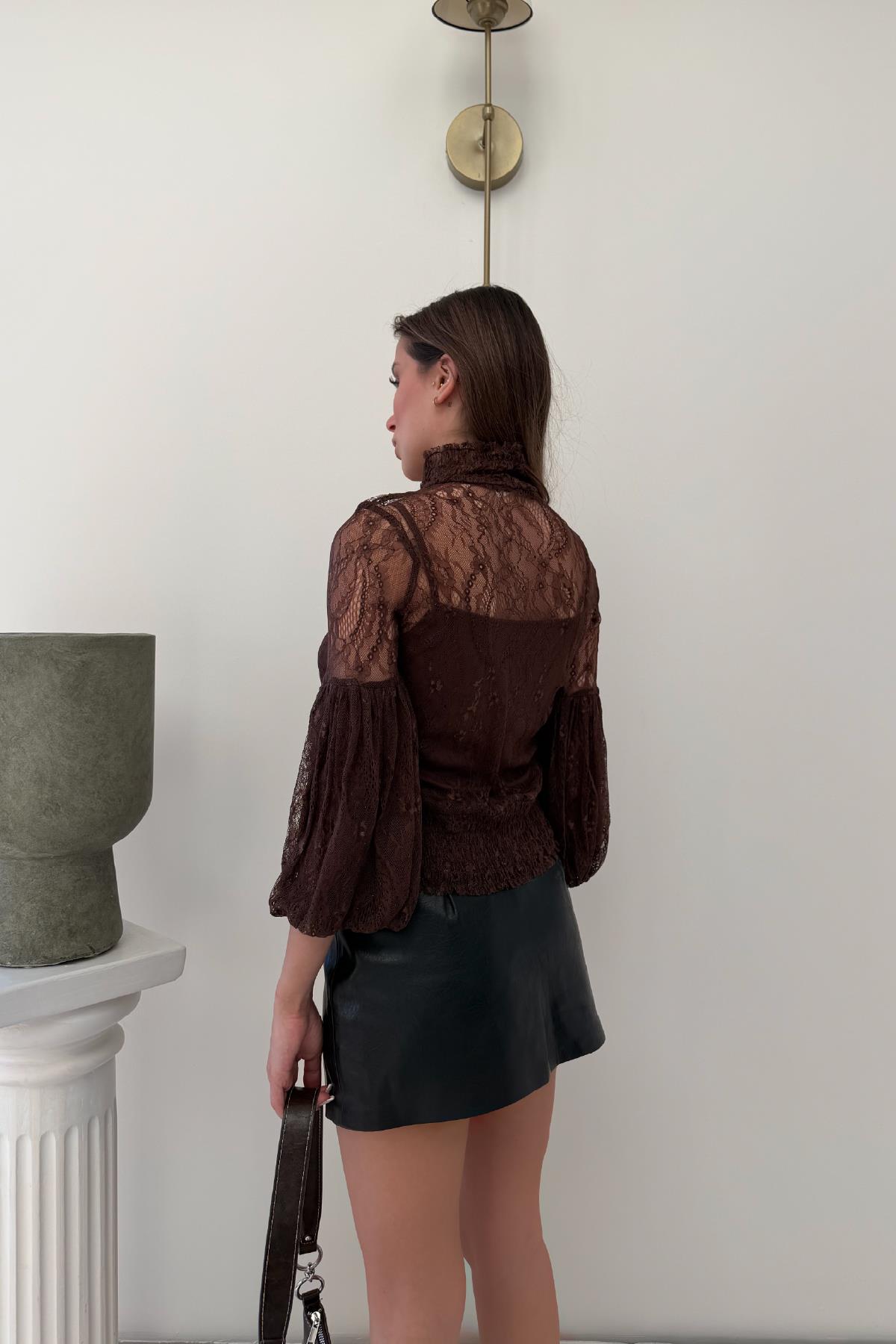 Kahverengi Halter Yaka Balon Kol Detay Dantelli Bluz (RB2952)