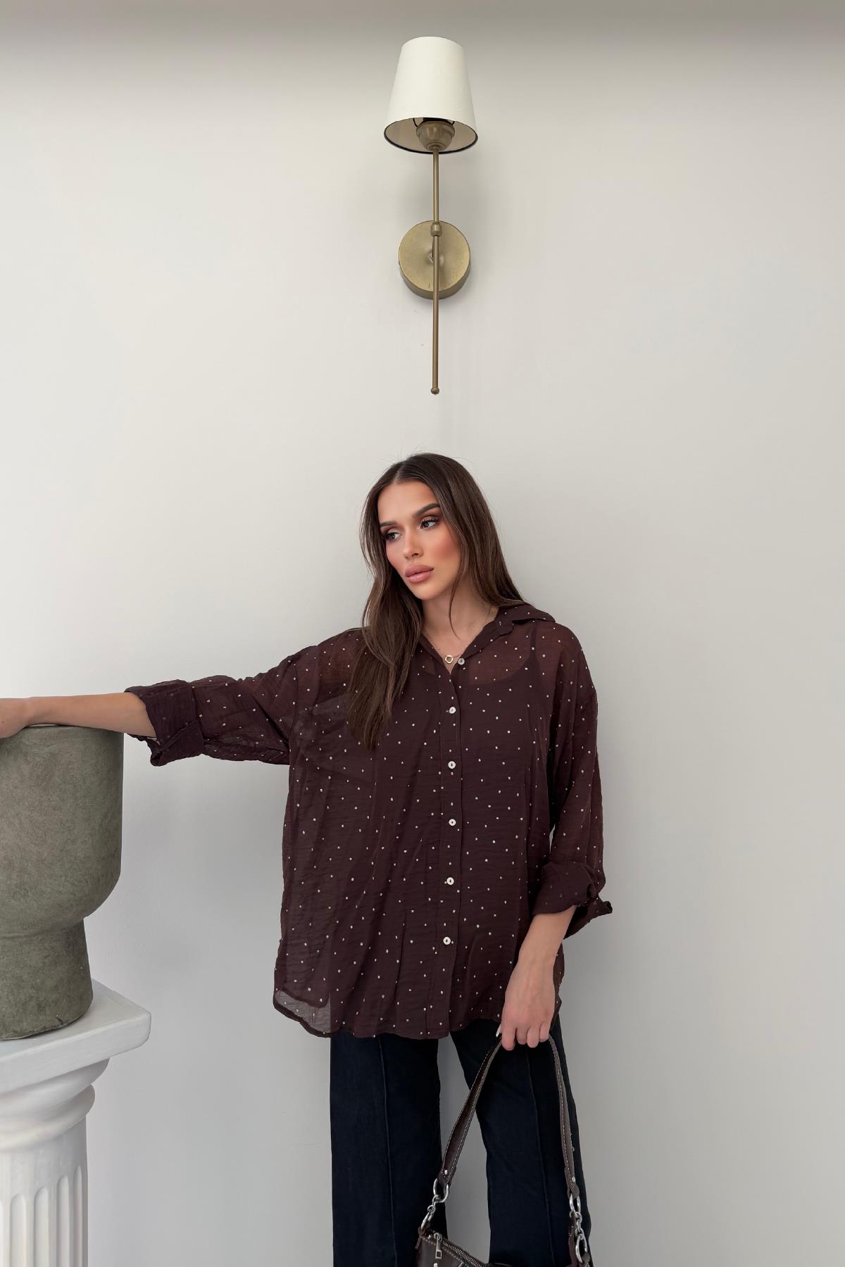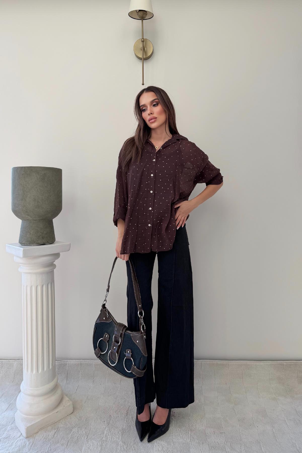Kahverengi Kendiliğinden Taş İşleme Detaylı Salaş Şifon Gömlek (RB2947)