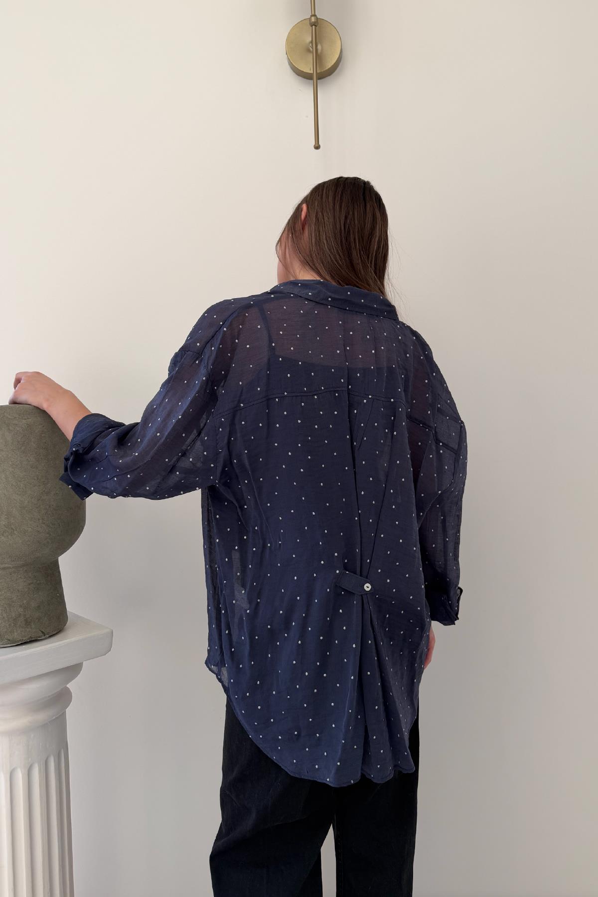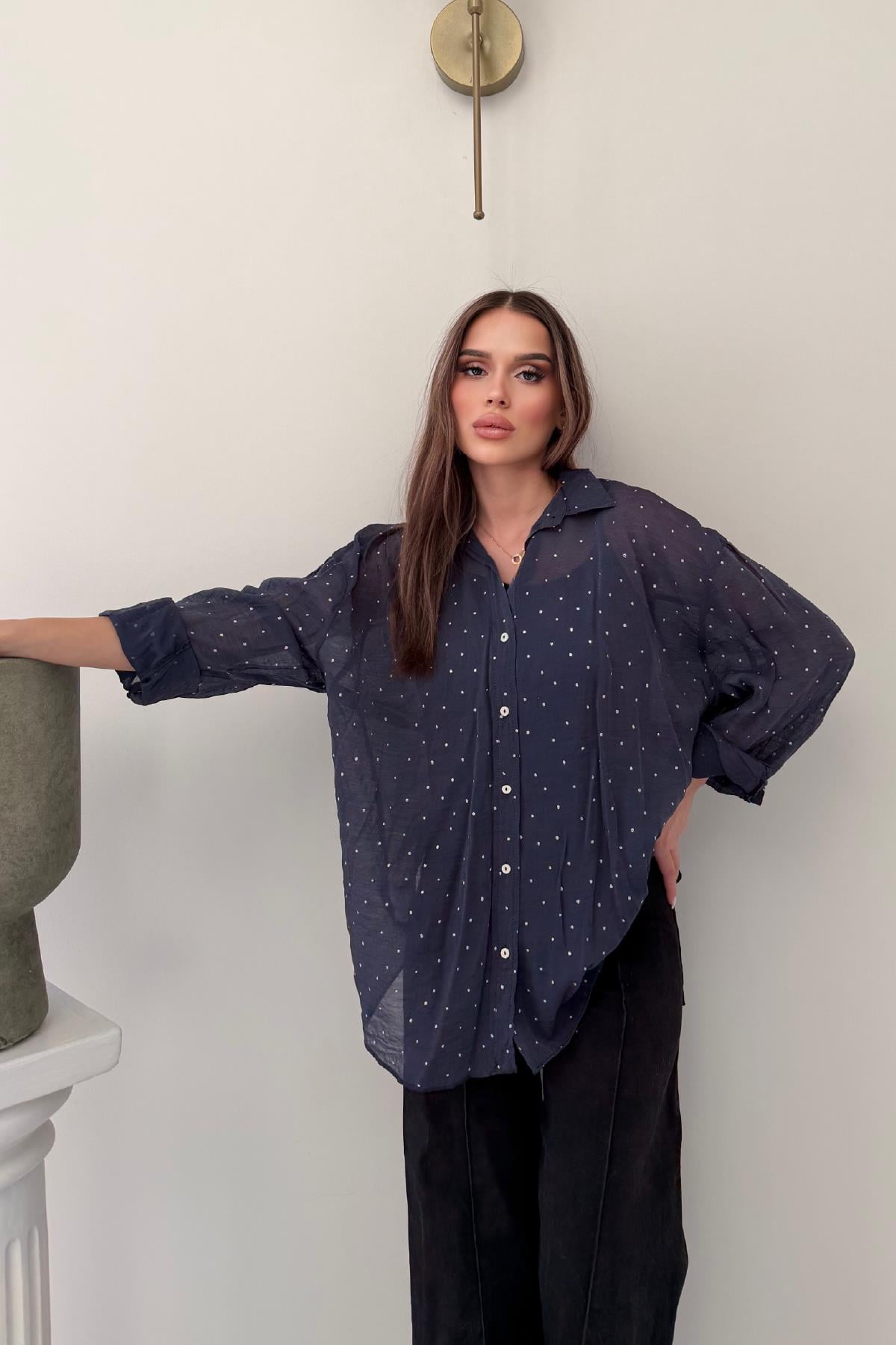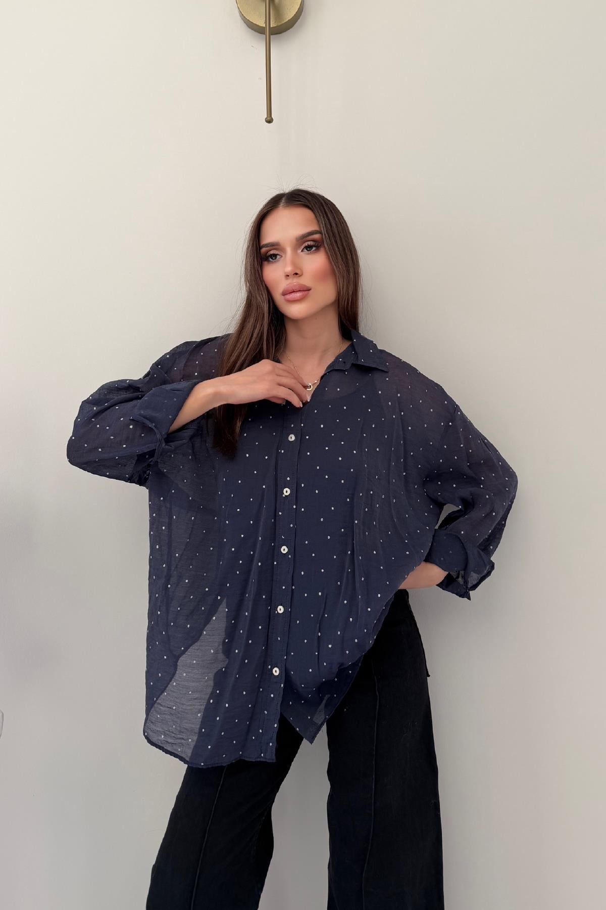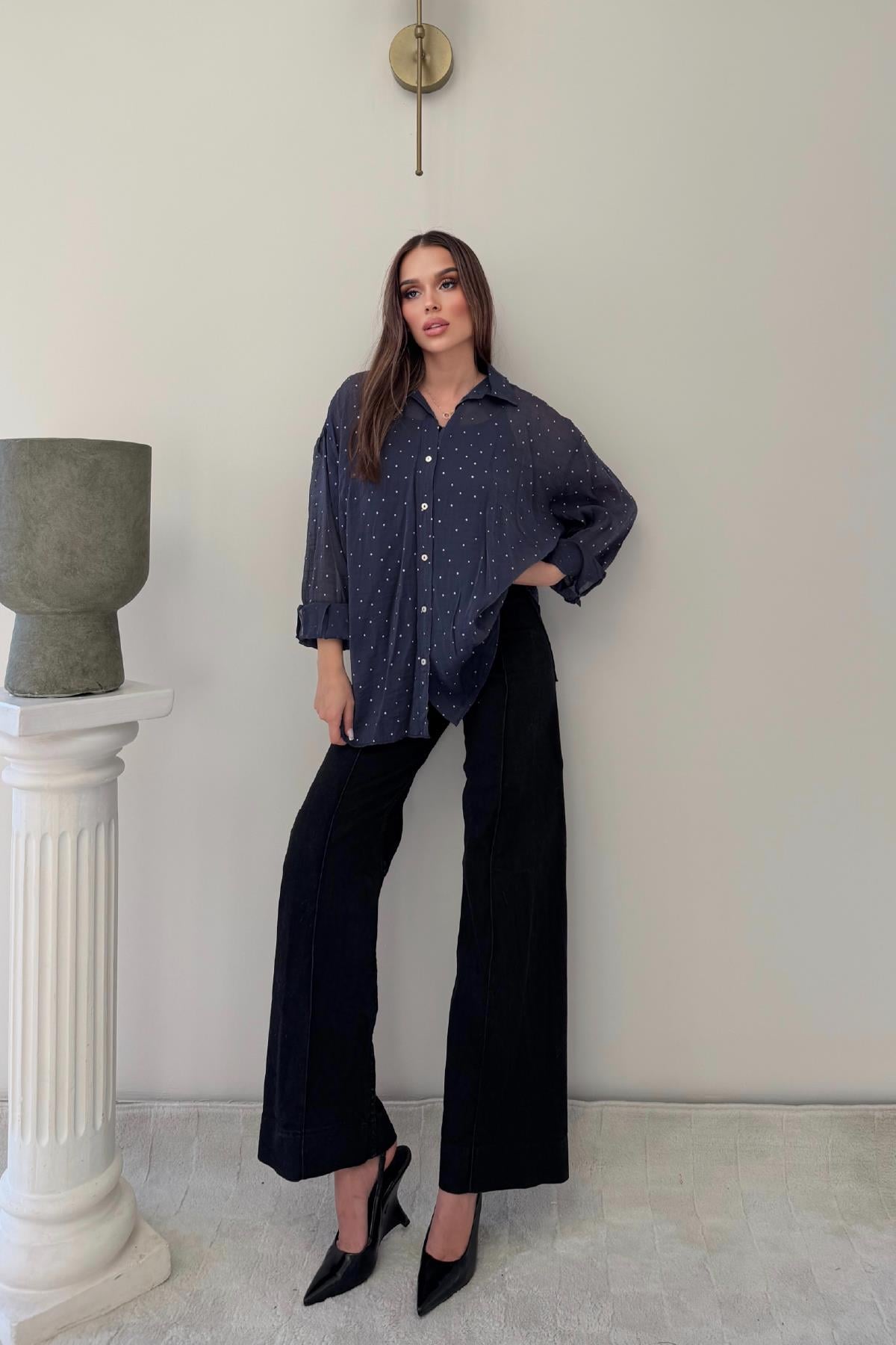 Lacivert Kendiliğinden Taş İşleme Detaylı Salaş Şifon Gömlek (RB2947)