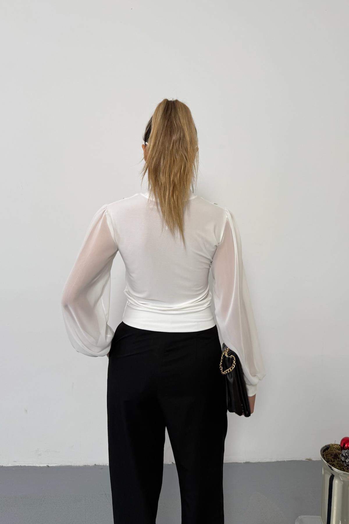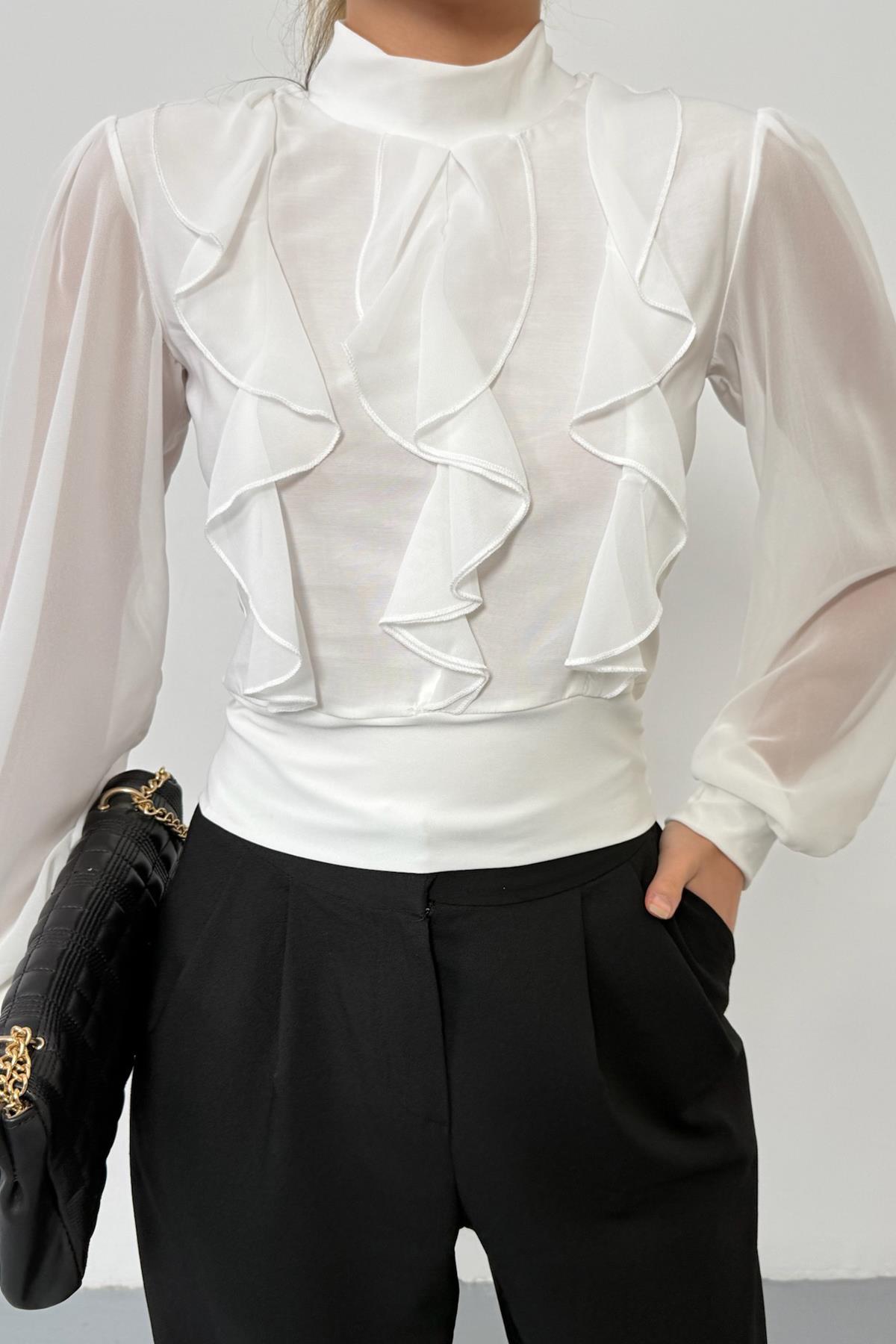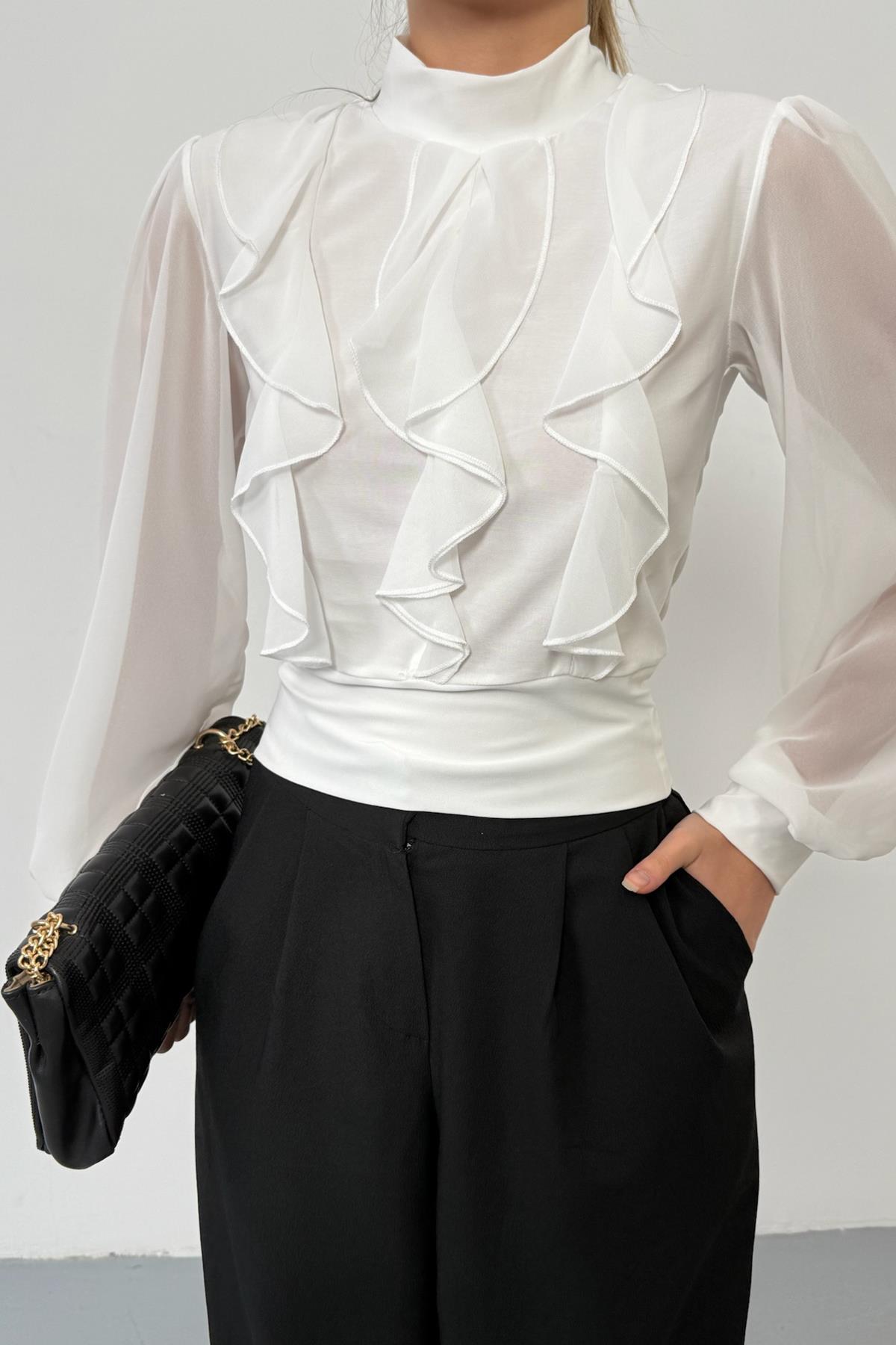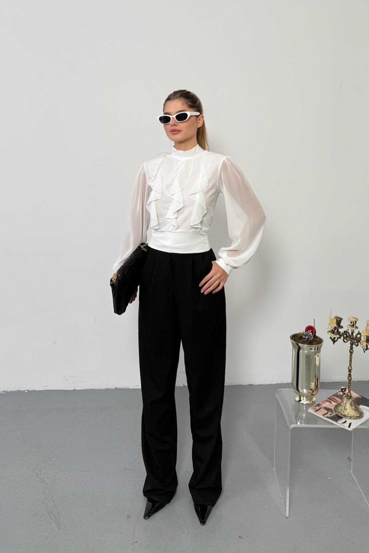 Şifon Balon Kol Fırfır Detaylı Dik Yaka Siyah Bluz Ekru (RB2924)
