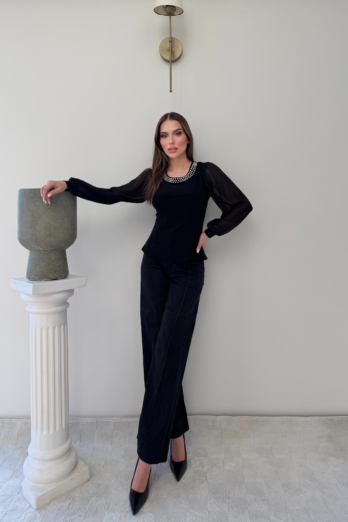 Siyah İnci Taş Detaylı Kolları Şifon Bluz (RB2945)